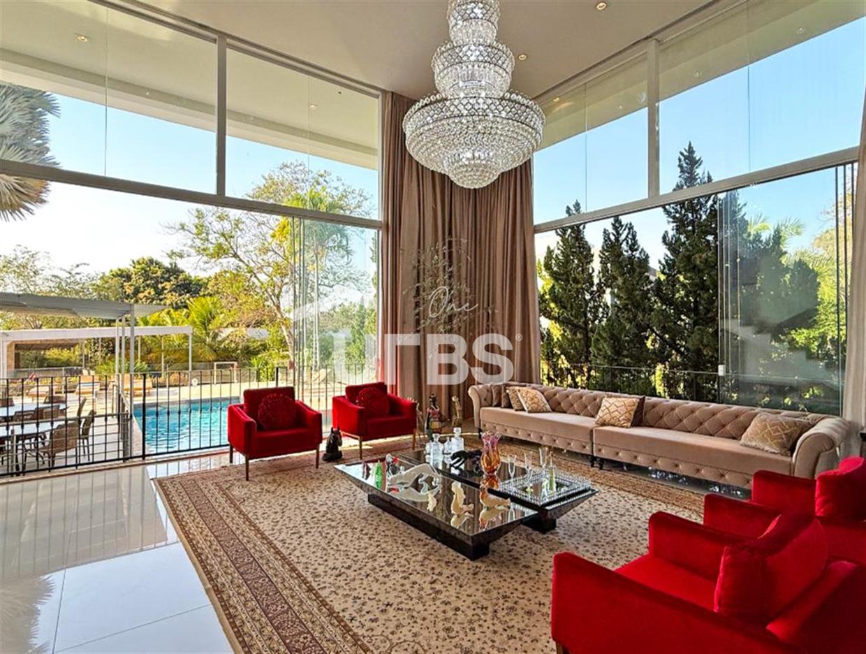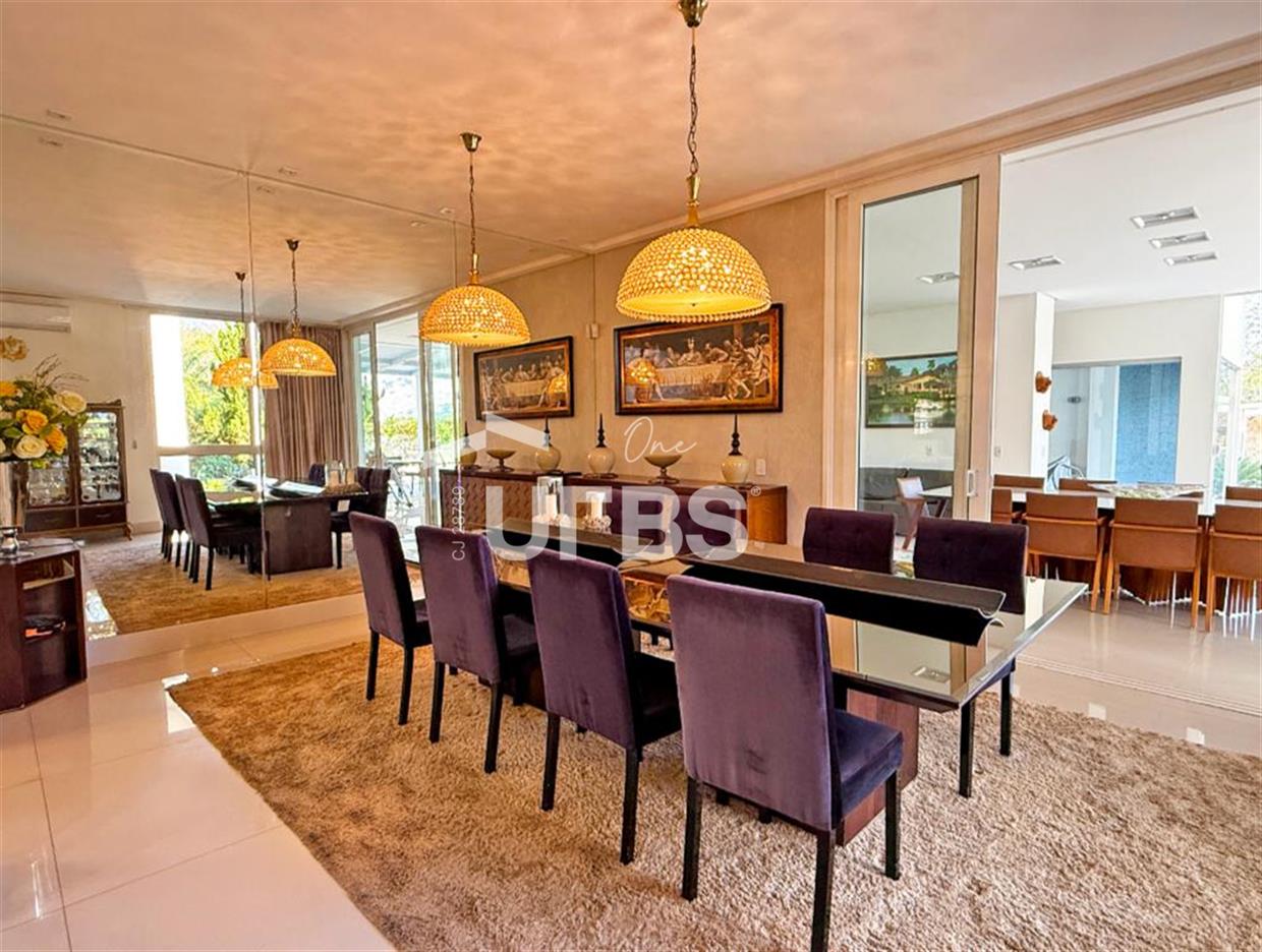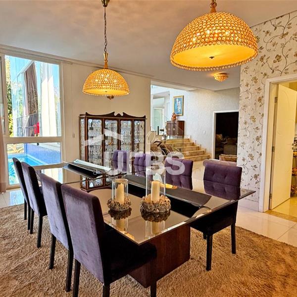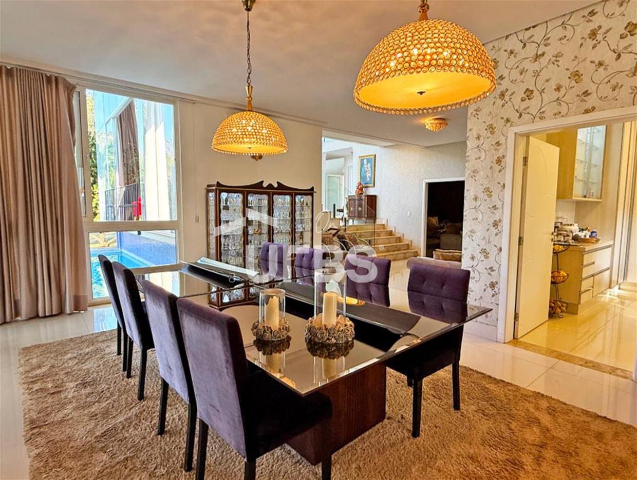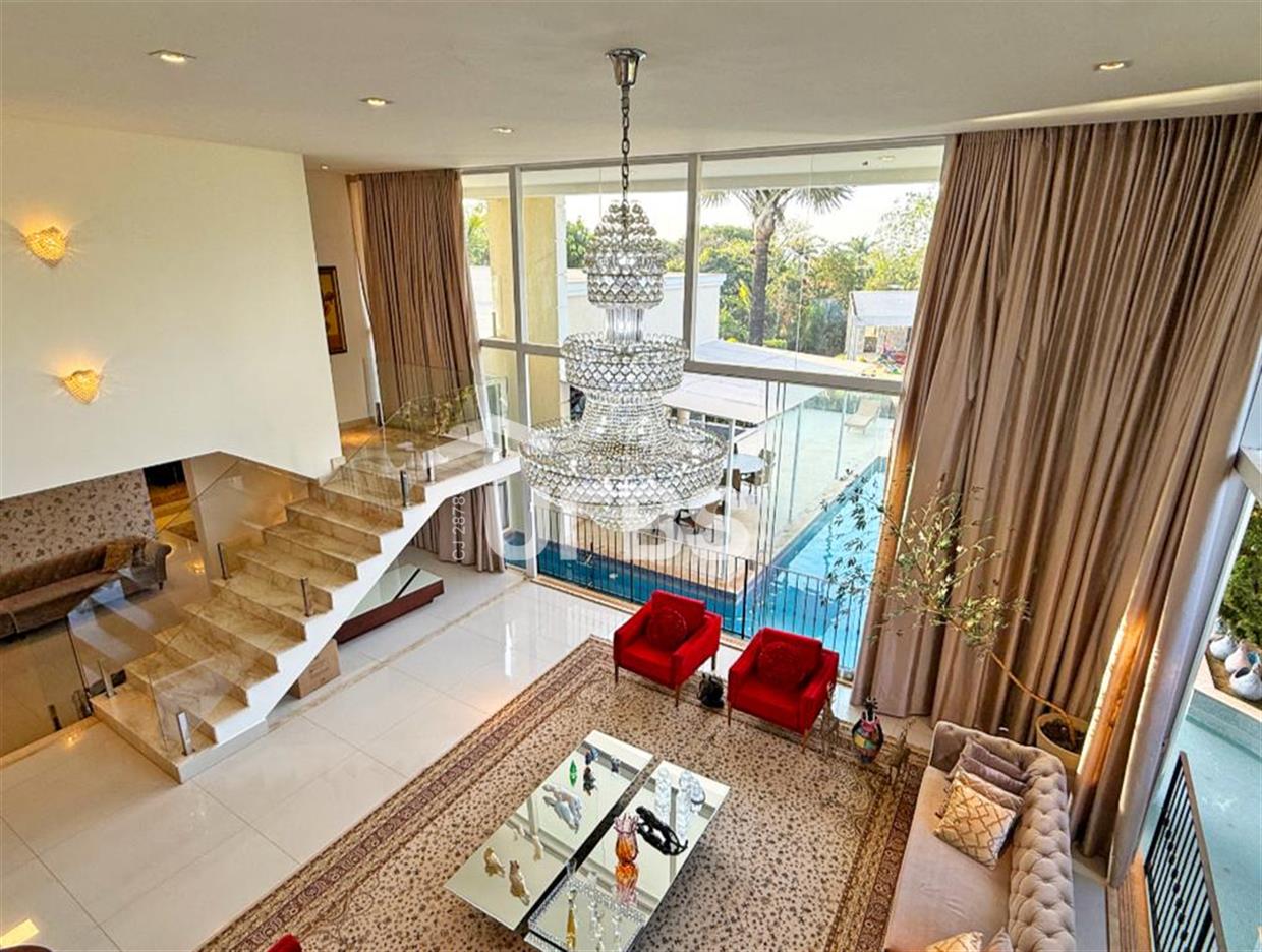 SOBRADO ESTILO NEOCLÁSSICO Sobrado no Aldeia do Vale: Fachada imponente, área privativa 679 m2, área do lote 2.979 m2, 4 vagas cobertas, lobby de entrada com pé direito duplo amplo, sala office + banheiro, 3 salas sendo uma de estar, 2° sala intima, 3° sala de jantar, Home Theaters, cozinha, área de serviço, dependência de empregada completa, cozinha com acesso interno ao espaço gourmet integrado a varanda direto a piscina e solarium, sauna, piso superior acesso pela escada, sala intima de tv, mirante com vista para o quintal, 5 suítes, 2 c/ varandas e 3 c/ balcony, salão de festa, gourmet + 2 lavabos,