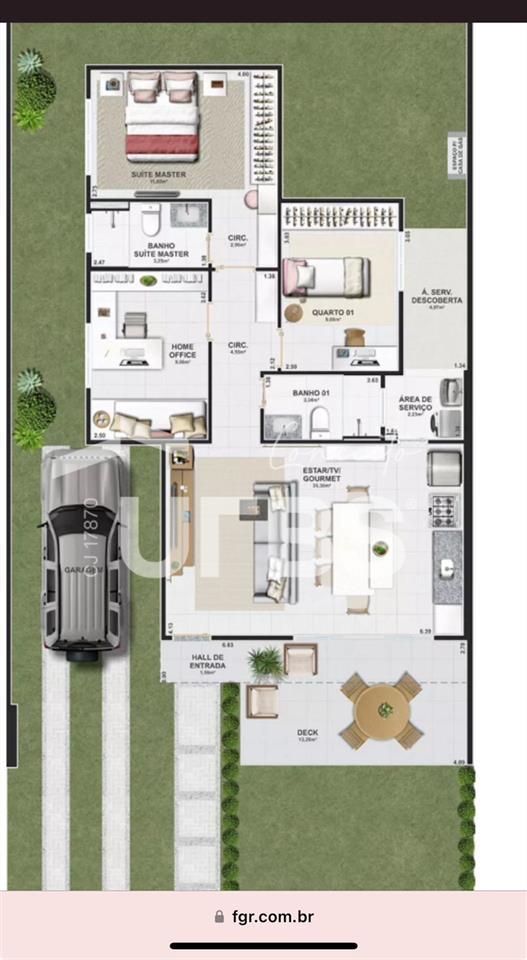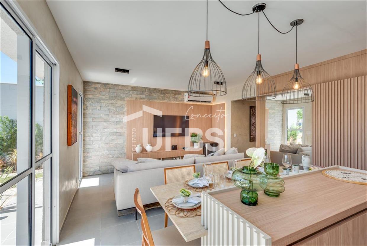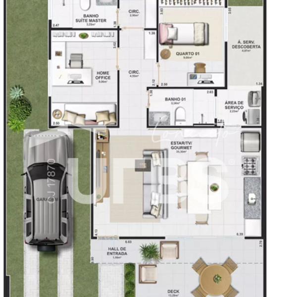 Jardins Cannes Casa Térrea com KIt Aroeira A casa térrea com 100m² de área útil e estará locada em um lote de 206,16m². A casa é composta por 3 quartos sendo .1 suíte máster. A casa abrange ainda em sua estrutura garagem com rampa de acesso, deck e sala 02 ambientes integrada a cozinha gourmet. O condomínio acompanha lazer completo com quadra poliesportiva, quadra de areia, espaço gourmet, academia, playground, dentre outros. O Jardins Cannes é muito bem integrado à cidade, o que proporciona uma localização especial, repleta de comodidades e conveniências. Alguns exemplos são o Shopping Buriti que fica a 5 minutos do condomínio e supermercado tático a apenas 1 minuto de distância. Data de Entrega Prevista para FEV/2026 Incluso KIT - Aroeira 1. Porcelanato 90x90cm em toda casa 2. Bancada da cozinha em Branco Siena Polido (D= 3,35m) 3. Porta de acesso de 90x230cm* 4. Porta de correr para deck com 3 folhas para maior iluminação 5. Telhado com platibanda dando maior imponência 6. Bancadas e tentos dos banheiros em Bege Bahia Polido 7. Duas cubas no banheiro da suíte master em Bege Bahia Polido 8. Esquadrias com veneziana 9. Porta da Varanda H=2,30cm 10. Porta da área de serviço externa com avanço proporcionando mais espaço coberto 11. Porcelanato 90x90cm na área de serviço 12. Rampa de acesso em Intertravado completa (sem grama) 13. Soleira da porta de acesso e área de serviço em Branco Siena Polido 14. Bancada em Branco Siena Polido com tanque em inox 15. Rodapé Banheiros de 80cm 16. Box banheiros com o mesmo porcelanato do piso 17. Louças e metais maiores