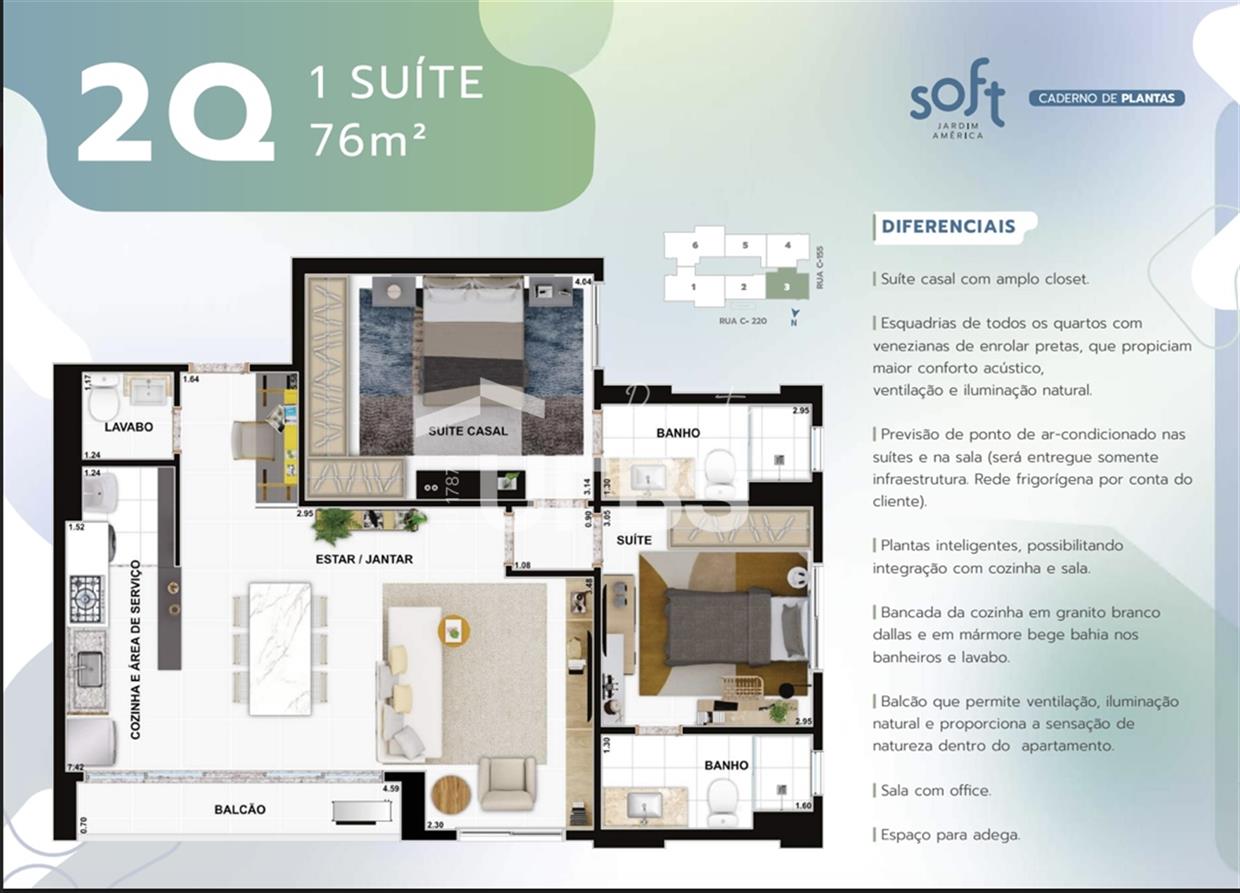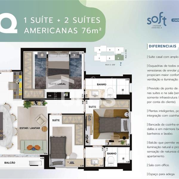 Soft Jardim América: Seu Refúgio Sofisticado a Passos do Vaca Brava no Setor Bueno! Descubra o privilégio de viver no coração do Jardim América, em Goiânia, a apenas 3 minutos do icônico Parque Vaca Brava. Apresentamos um apartamento exclusivo no prestigiado Condomínio Soft Jardim América, onde o conforto e a elegância se encontram. Este apartamento de 77m², localizado no 16º andar, foi inteligentemente modificado para oferecer 2 suítes espaçosas e uma sala ampliada, perfeita para momentos inesquecíveis. Além disso, conta com um lavabo e 1 vaga de garagem. Desfrute de um lazer completíssimo, pensado para toda a família, e prepare-se para a entrega em Junho de 2026. Uma oportunidade única de viver em um imóvel moderno e sofisticado, com a qualidade Soft Jardim América.