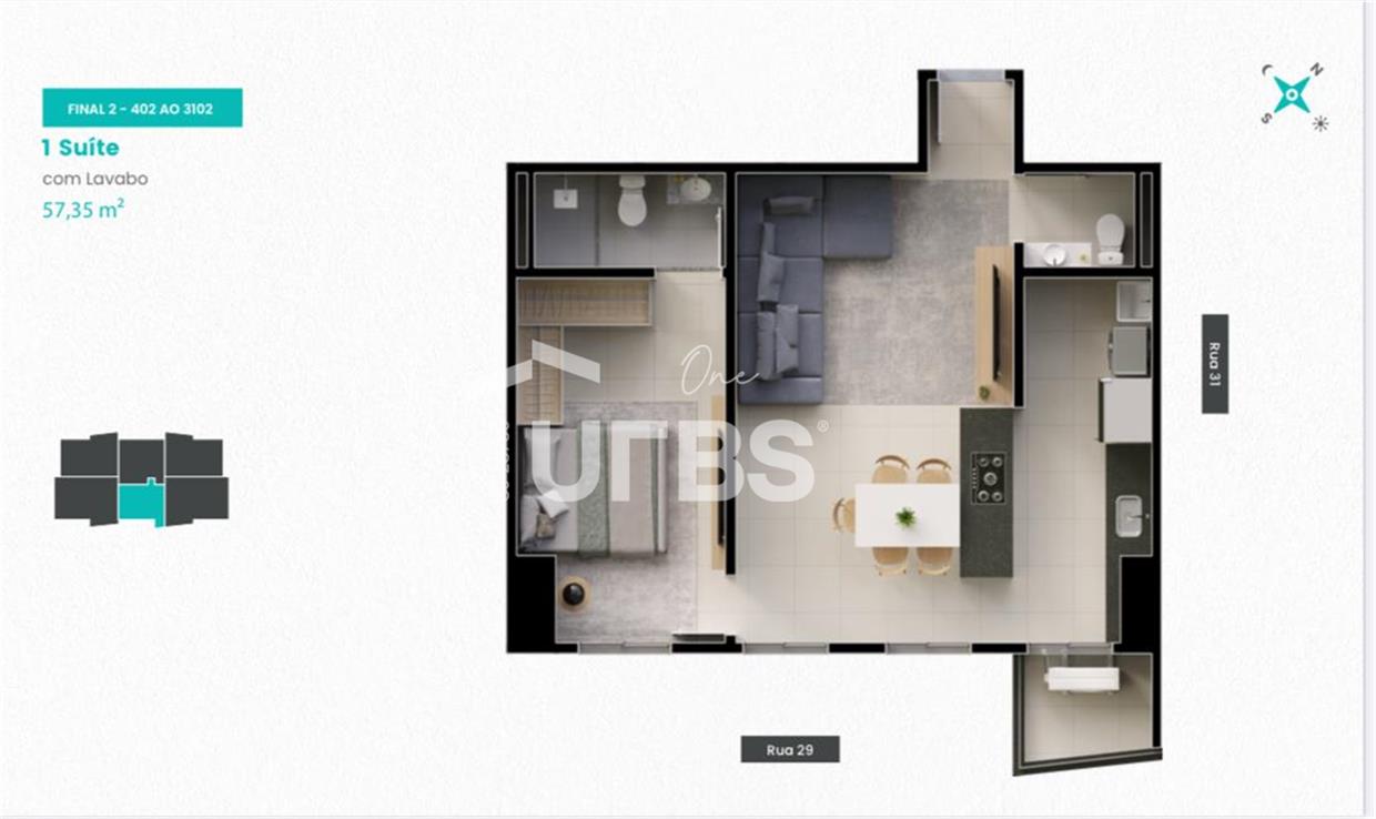 APTO DE UM QUARTO VISTA BOSQUE DOS BURITIS Sala para 2 ambientes com lavabo, ampla suíte, cozinha, área de serviço e laje técnica . obs. a unidade já foi pago pelo proprietário a fiação de rede frigorífera ! Andar alto