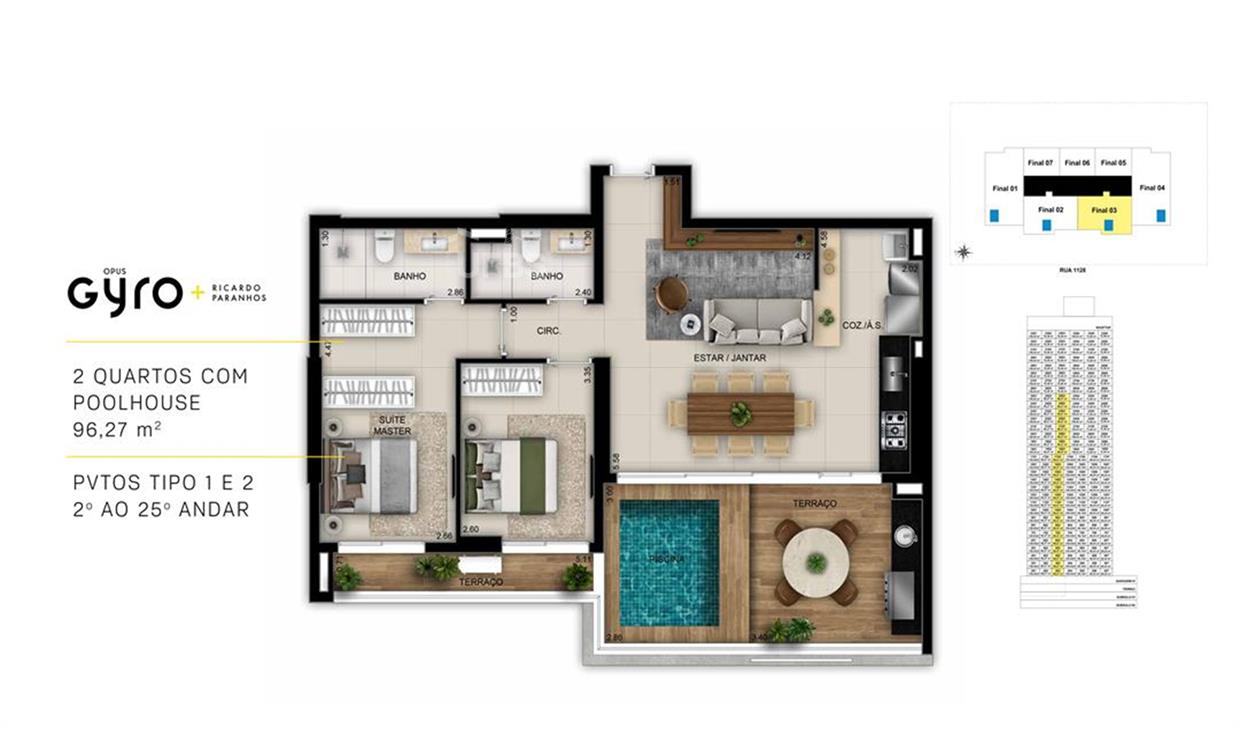 Opus Gyro Ricardo Paranhos: Apartamento de Alto Padrão com Rooftop Exclusivo no Setor Marista Descubra o ápice do design moderno neste apartamento de 96,27 m² no coração do Setor Marista, Goiânia. Localizado no prestigiado Condomínio Opus Gyro Ricardo Paranhos, este imóvel em construção oferece 1 suíte plena para o máximo de conforto e privacidade. Desfrute de uma generosa varanda gourmet, perfeita para momentos de lazer e convívio, complementada por uma varanda com piscina privativa. Os 4 banheiros sociais, incluindo um lavabo, contam com ventilação natural. O apartamento, situado no 4º andar, dispõe de 2 vagas de garagem e se integra a um condomínio com diferenciais exclusivos no rooftop: piscina adulto e infantil, academia equipada, sauna com SPA, lounge gourmet com design exclusivo, espaços multiuso e vista panorâmica. Facilidades como coworking, minimercado, sala de reuniões, gyro market, lavanderia e playground elevam a experiência de morar. Viva próximo ao Parque Areião, Goiânia Shopping e Parque Vaca Brava, além de renomados restaurantes como 1929 Tratoria Moderna, Íz Restaurante, Tatu Bola, Alata Sorveteria e Beef Bistrô, e do Empório Prime, tudo ao seu alcance.