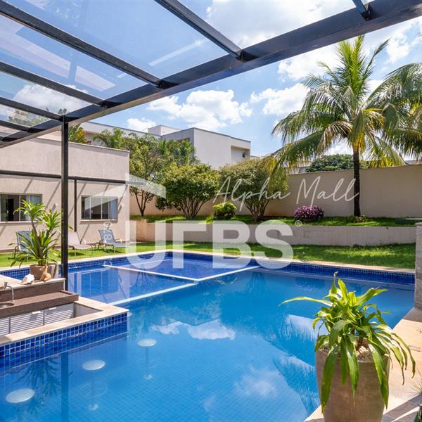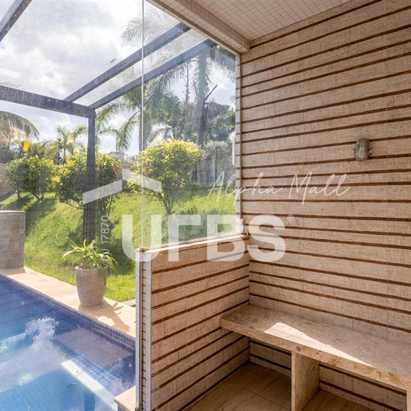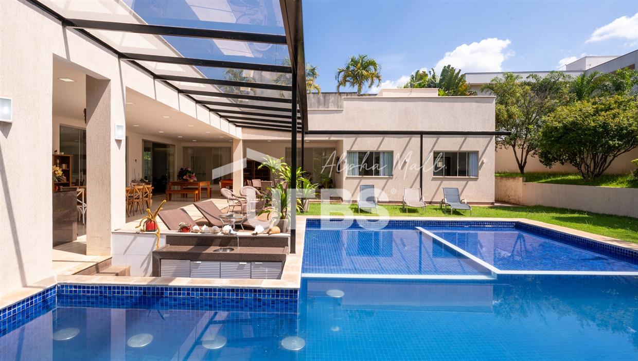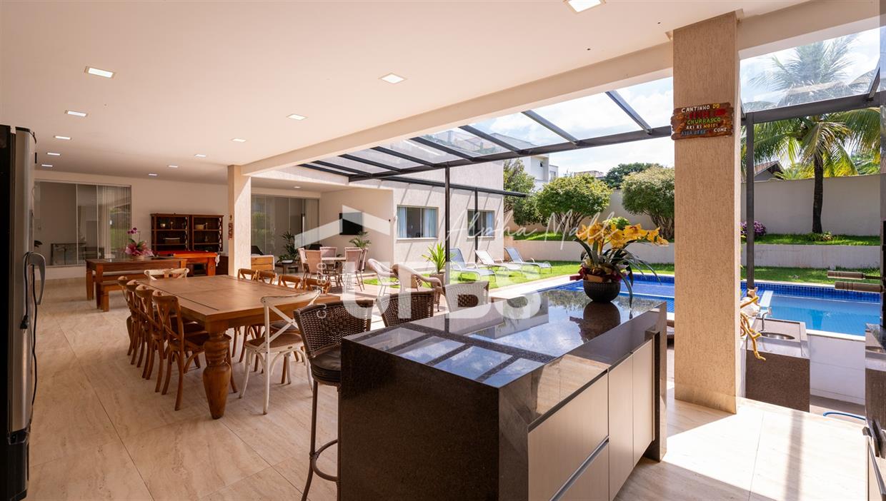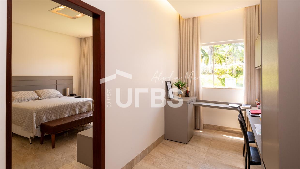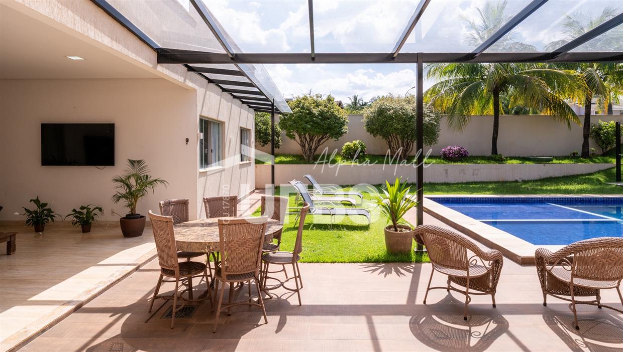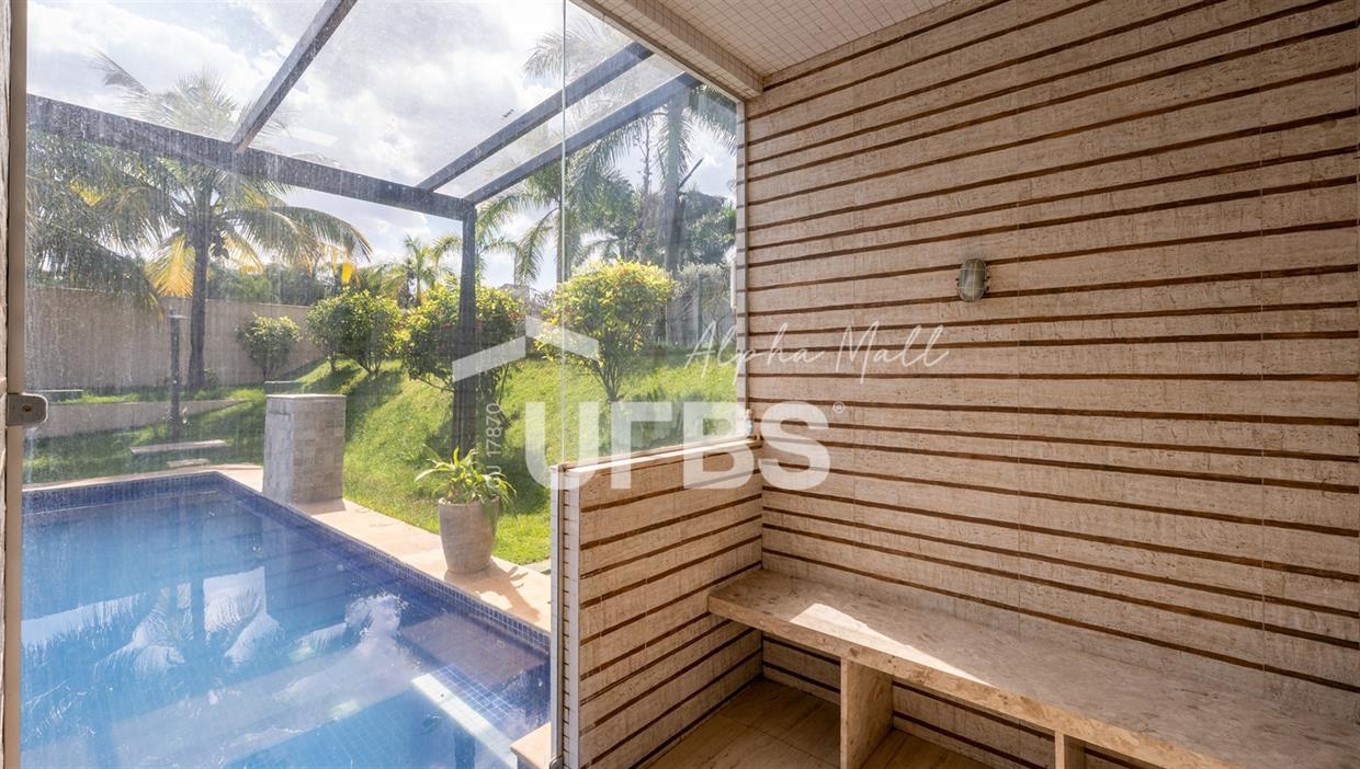 Casa Térrea de Esquina no Alphaville GoiásLocalizada no prestigiado condomínio Alphaville Goiás, esta casa térrea de esquina une imponência, funcionalidade e lazer completo em um projeto cuidadosamente planejado. A área íntima conta com 04 quartos, sendo 02 suítes, com destaque para a suíte master, que oferece escritório privativo, closet e um elegante banheiro com hidromassagem — um verdadeiro refúgio de conforto e privacidade. A residência dispõe ainda de roupeiro no corredor, garantindo praticidade e organização. Os ambientes sociais são integrados e bem distribuídos, contemplando sala de TV, sala de jantar e sala de estar, além de lavabo para atender às visitas com comodidade. O grande diferencial da casa é a área de lazer, projetada para proporcionar momentos únicos de convivência e relaxamento. A piscina ampla, aquecida e com hidromassagem é integrada à sauna, criando um ambiente moderno e sofisticado. O espaço conta ainda com vestiários feminino e masculino, oferecendo total conforto aos convidados. Completam o imóvel dependência de funcionário, cozinha funcional e área de serviço reservada. Uma residência que alia elegância, lazer completo e excelente localização, ideal para quem busca qualidade de vida, conforto e exclusividade.